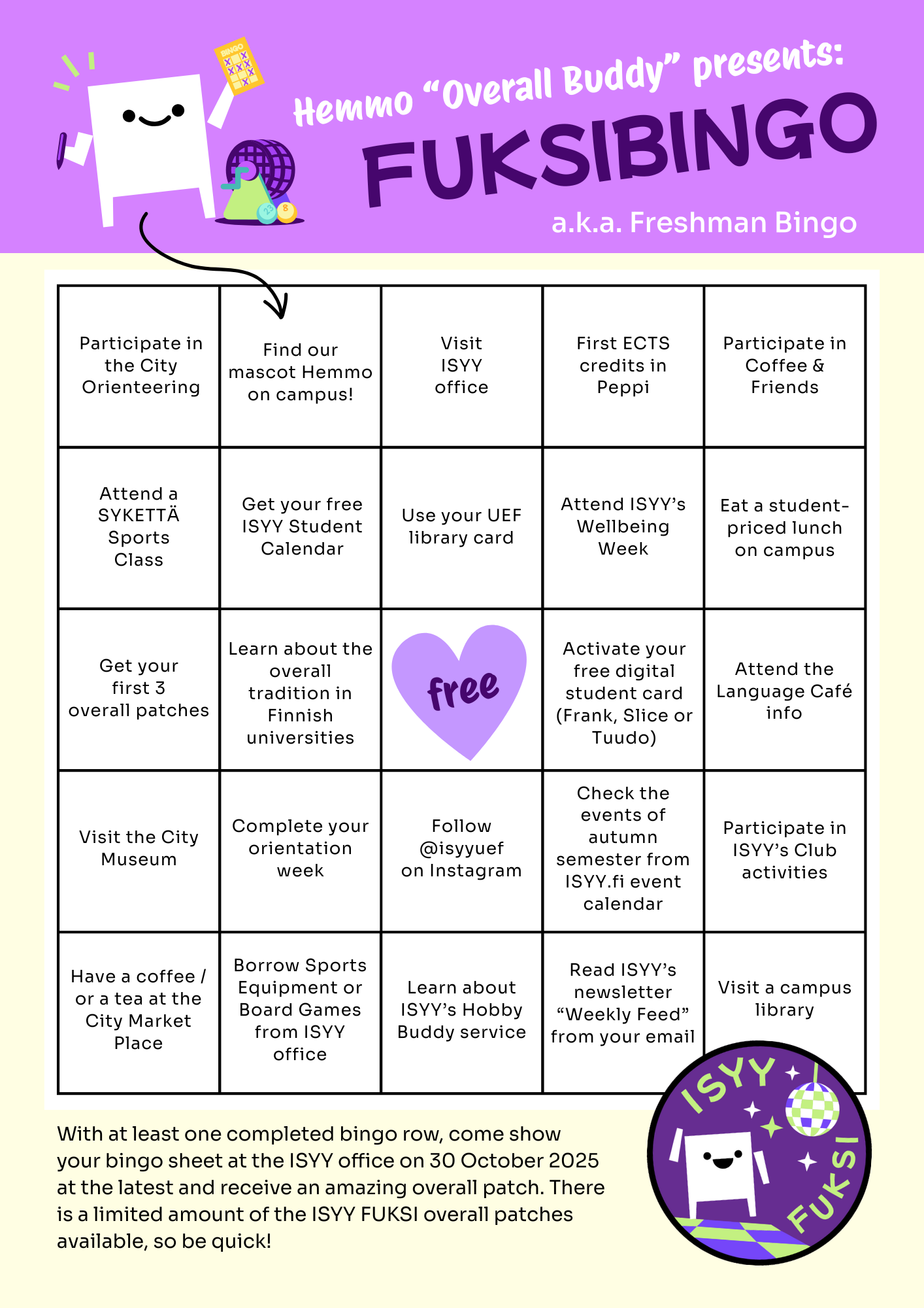 Only new students of UEF who have joined ISYY can participate in the Freshman Bingo during the autumn semester till Thursday 30 October 2025. The participants aim to complete the tasks listed on the bingo sheet and mark off each task as they finish it. After a student has completed at least one (1) bingo row, they can come to the ISYY office during opening hours to pick up their overall badge and to join the Freshman Bingo Raffle. A bingo row can be formed vertically, horizontally, or diagonally from corner to corner. At the office, the student must present their completed bingo sheet along with a valid student card (Frank or Slice) to the ISYY staff. The Freshman Bingo can be played until 3 pm on Thursday 30 October 2025. The overall patch must also be collected by this deadline.