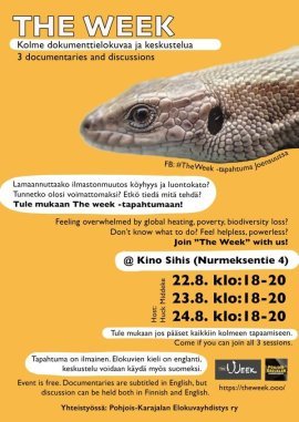 Then it would be really good if you could join "The Week" with us at Kino Sihis (Kulttuuritehdas Siihtala, Nurmeksentie 4) on: