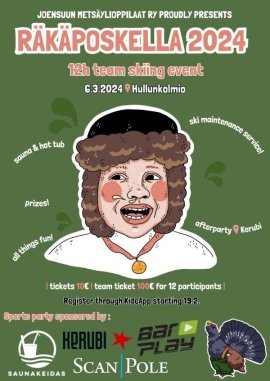 The forestry students’ association, Joensuun Metsäylioppilaat ry, organizes the fun, legendary and annual “Räkäposkella” cross-country skiing competition for all students in Joensuu! The competition is held on the 6th of March in Hullunkolmio (near the university’s campus buildings Natura and Futura).