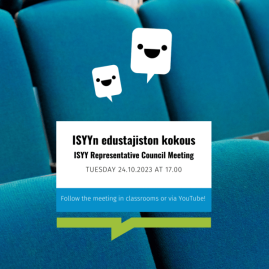 ISYY Council will hold its next meeting 6/2023 after two weeks on Tuesday 24 October at 5 pm. At the meeting the Council will, among other things, decide the amount of the ISYY membership fee for the Academic Year 2024-2025. The ISYY Council will also make the decision about acquisition of a new office facility in Joensuu. This decision is shifted from the previous meetings, that did not have a quorum.