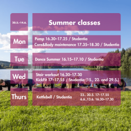 The SYKETTÄ summer season classes will be held from May 20th to June 14th, and the second part from August 19th to August 31st. Classes will take place both in the Studentia sports hall and outdoors, enjoying the summer weather.
