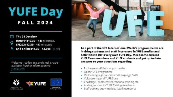 As part of UEF's International Week, we invite all students and staff members to our YUFE Day. Join us to ask your YUFE questions, meet YUFE team members and students!