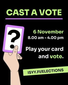 As you might have noticed, the Election Day of ISYY's Representative Council elections is almost here! ISYY members have the right to vote via the electronic election system on 6 November between 8 am and 4 pm. Vote for the student who represents you the best to ISYY's highest decision-making body, the Representative Council.